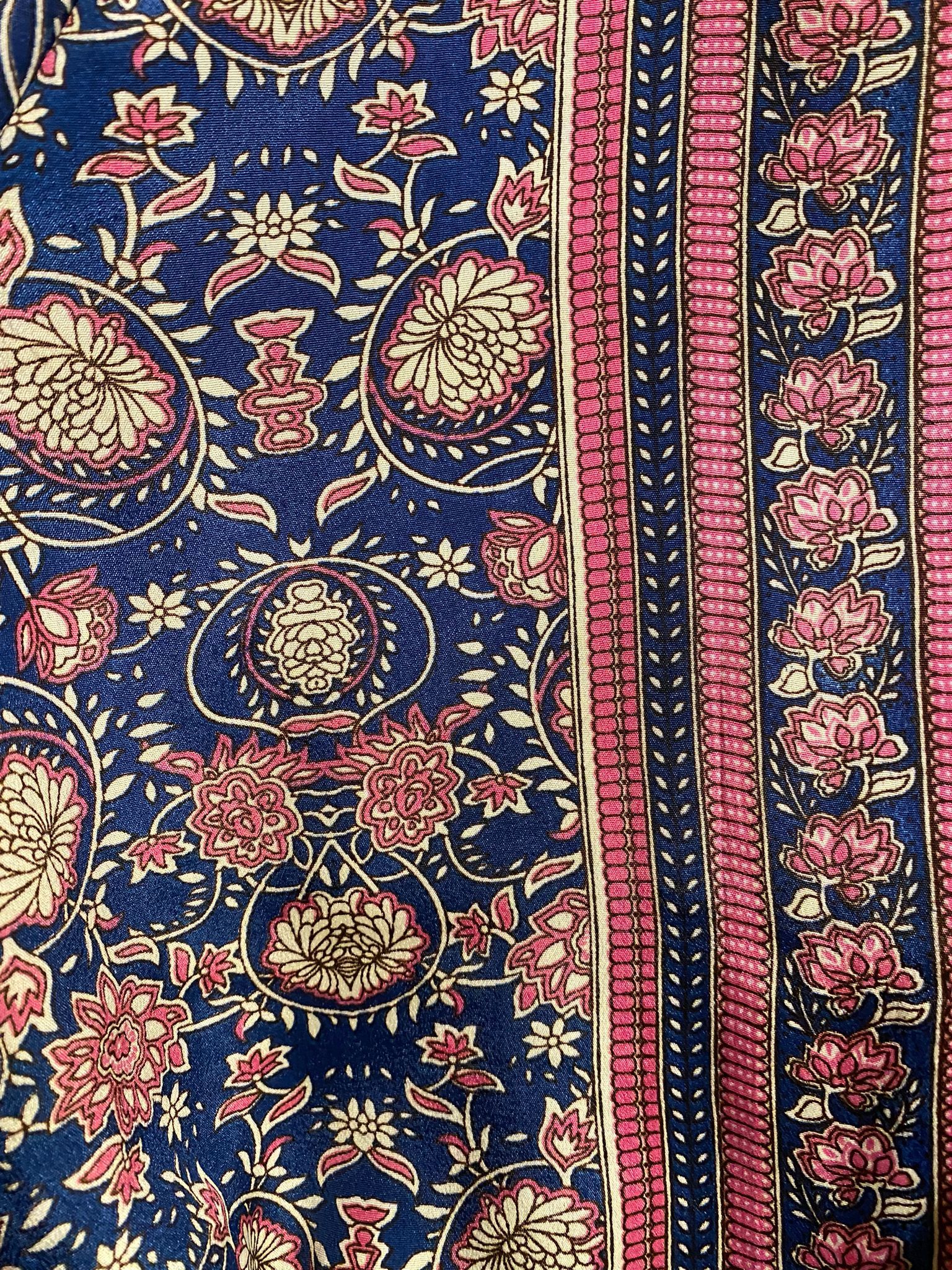 Ein einzigartiger Kimono mit floralem Muster aus leichtem, weichem Seidenmaterial und Glockenärmeln. Er kann offen getragen oder mit dem Gürtel umwickelt werden. Ein optionaler Knopfverschluss im Brustbereich sorgt für eine dezentere Variante.
