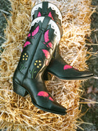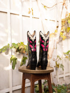 Diese Cowboystiefel für Damen bieten höchsten Tragekomfort dank ihrer gestapelten Ledersohlen, die sich mit der Zeit perfekt an Ihre Füße anpassen. Die schwarzen Lederstiefel verfügen außerdem über einen besonders bequemen, gepolsterten Blockabsatz, der Ihnen den ganzen Tag über sicheren Halt und einen stilvollen Auftritt garantiert. Ganz im Trend der klassischen Western-Silhouette bestechen diese Cowboystiefel durch Anziehschlaufen und ausgeschnittene, magentafarbene Schmetterlings- und gelbe Blumenapplikationen am mittelhohen Schaft, die jedem Outfit einen Farbtupfer und Eleganz verleihen. Der weiße Rand am Schaft rundet das feminine Design ab.
